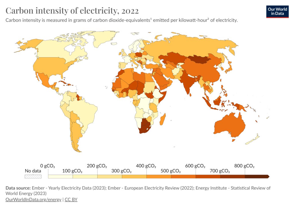 The number you get back will depend a lot on where you live – if you live in France, where there’s a lot of nuclear and a fair chunk of hydro, the value will be around 80g/kWh, the UK, which has good wind resources but has gas power stations as a backbone, emissions are around 260g/kWh. Finally the US around 360-380g/kWh, though this varies a lot by state. You can see how the carbon intensity of electricity supply varies on the map below (source OurWorldInData).